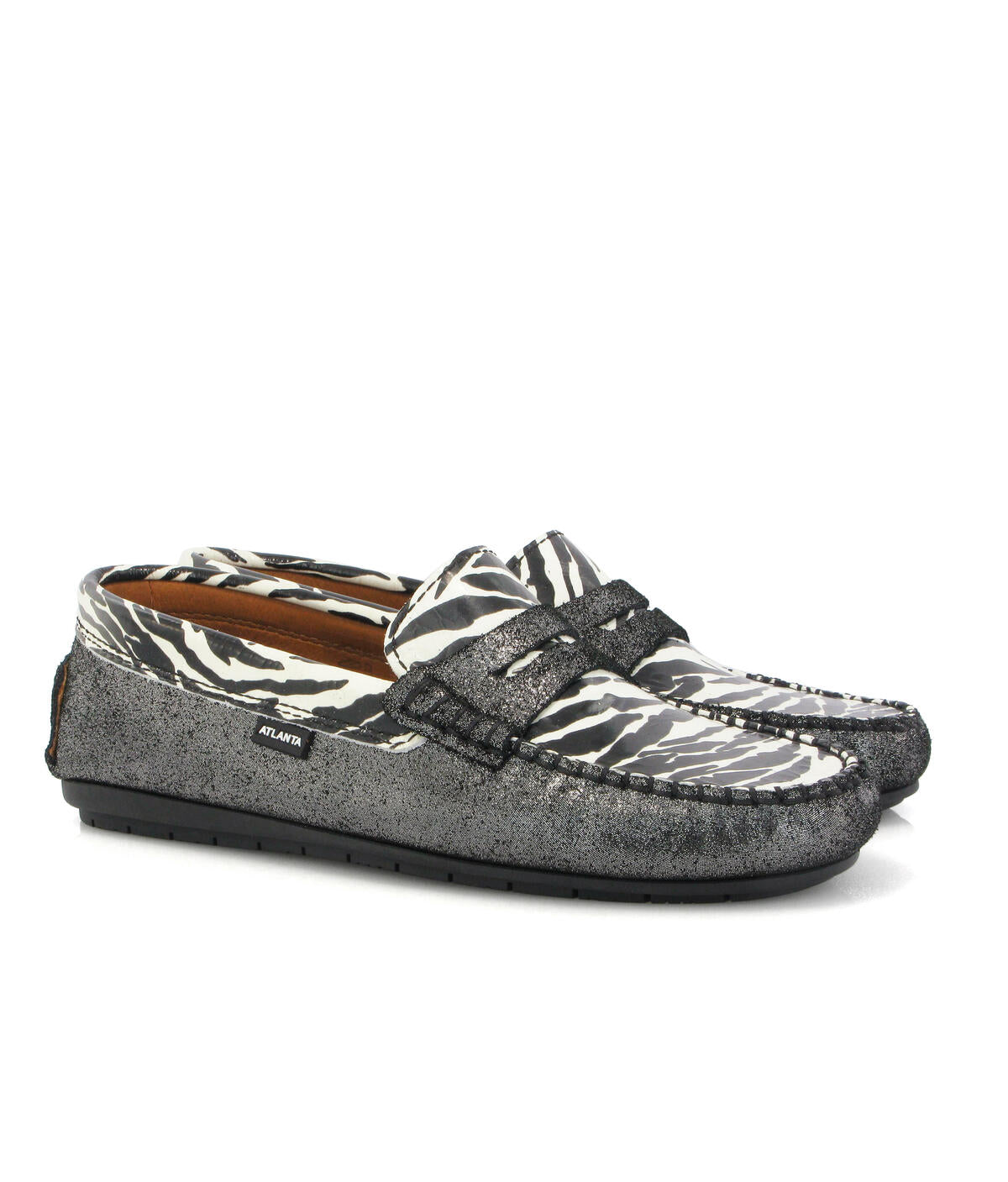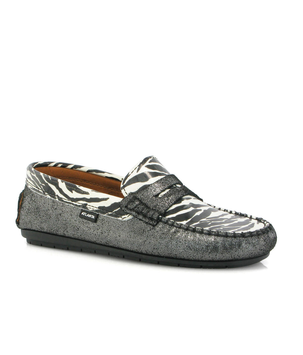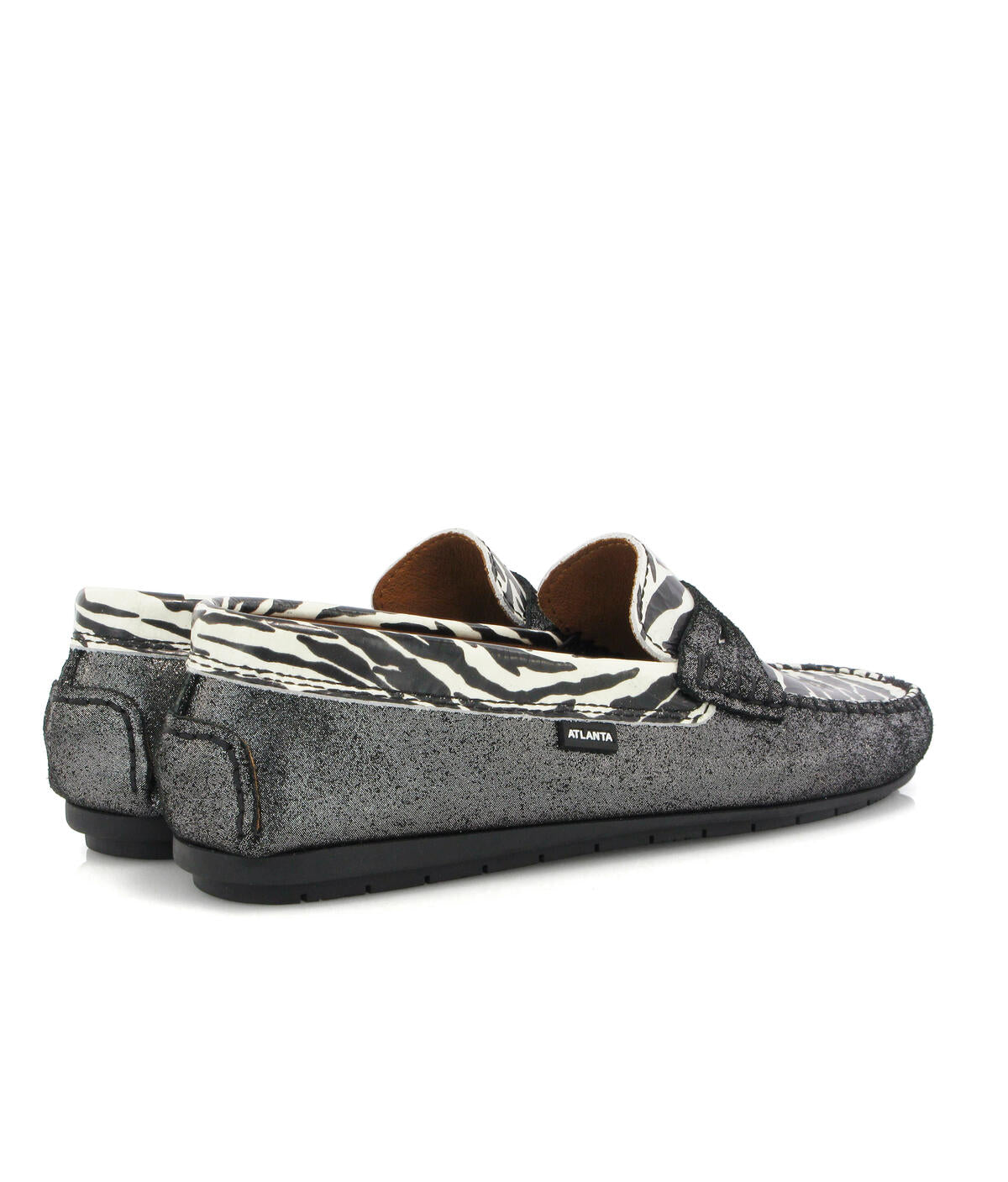 • Mocassins Originals em pele cinza efeito glitter e pala com estampado zebra a contraste