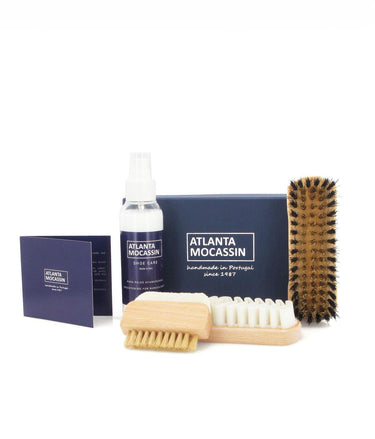 Kit para manter os seus mocassins de camurça e nobuck como novos. Inclui uma escova de arame com cabo de madeira, uma escova de borracha, uma escova de arame com borracha e um spray de brilho neutro.